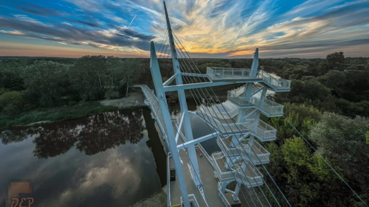 Sporą atrakcją dla turystów jest wieża widokowa z dwoma platformami - na wysokości 12 i ponad 20 metrów. Z wyższej rozpościera się widok na rzekę i malowniczą okolicę. Kładka i wieża również efektownie prezentują się po zmroku, są bowiem oświetlone.