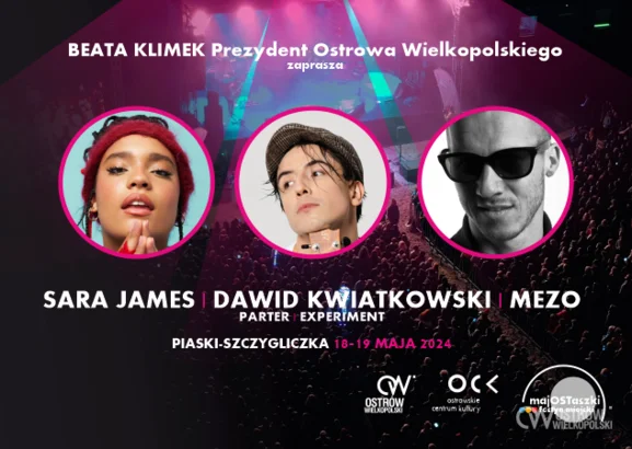 MajOSTaszki to wielkie święto w Ostrowie Wielkopolskim. Dawid Kwiatkowski to artysta o którego prosicie każdego miesiąca w mailach i wiadomościach i jestem przekonana, że swoim koncertem na finał majOSTaszków zachwyci. Będzie również Sara James, Mezo oraz lokalne Experiment i ostrowski PARTER. Szykujemy dla Was jeszcze wiele atrakcji na ten majowy weekend. Zapraszam na Piaski 18 i 19 maja! - zaprasza Beata Klimek, prezydent Ostrowa Wielkopolskiego.