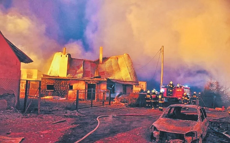 Początkowo strażacy gaszą płonące budynki i polewają wodą te, które jeszcze nie zajęły się ogniem. Do samego gazociągu nie mogą podejść. Temperatura jest za wysoka. Płomienie szaleją.