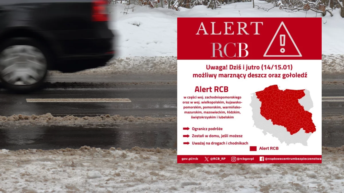 „Uwaga! Dziś i jutro (14/15.01) możliwy marznący deszcz oraz gołoledź. Ogranicz podróże. Zostań w domu, jeśli możesz. Uważaj na drogach i chodnikach".