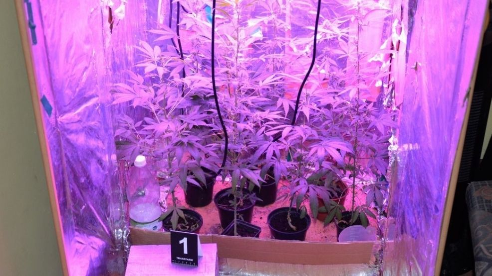 Po wejściu do podejrzanego pokoju, policjanci zauważyli, że w szafie zapalone jest światło. Okazało się, że w środku znajduje się 8 doniczek z krzakami konopi. Wnętrze szafy było oklejone srebrną folia, a cała uprawa była dogrzewana lampami.