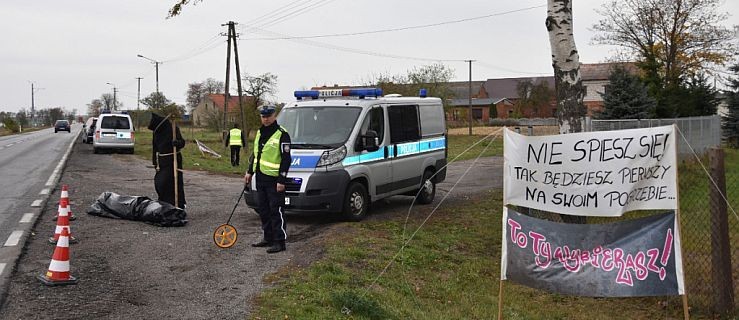 Na poboczu drogi leżał worek na zwłoki, a nad nim stała kostucha. Uwagę zwracali także umundurowani policjanci, którzy zabezpieczali ślady i wykonywali czynności jak na miejscu wypadku.