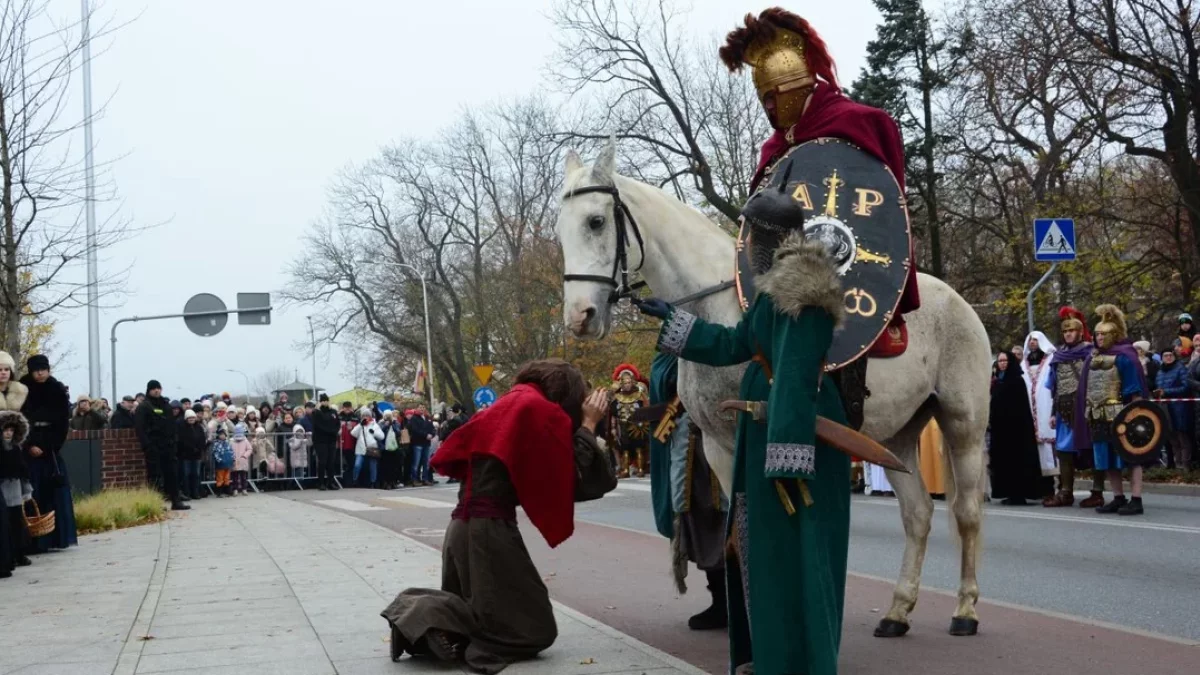 Już w czasie sumy odpustowej nie sposób było nie zauważyć kilku osób w kostiumach. Marek Sobczak - dyrektor Wydziału Oświaty i Kultury Urzędu Miejskiego wraz z regionalistą Wojciechem Koterbą w kościele prezentowali się w rzymskich zbrojach. Tuż obok nich w pierwszej ławce zasiadła burmistrz Urszula Wyremblewska-Korzyniewska w pięknej fioletowo-różowej kreacji uzupełnionej stylowym kapeluszem. W ręce trzymała symboliczny klucz do miasta, który później - na rozpoczęcie inscenizacji legendy o św. Marcinie - przekazała głównemu bohaterowi. Do tej pory włodarze zwykle przemawiali na rozpoczęcie przedstawienia przygotowywanego przez Stowarzyszenie Bellator Societas z Poznania wraz z Biblioteką Publiczną Miasta i Gminy Jarocin, ale nie zdecydowali się stać częścią tego plenerowego widowiska, które w tym roku zorganizowano w poniedziałek (11 listopada) już po raz czwarty.