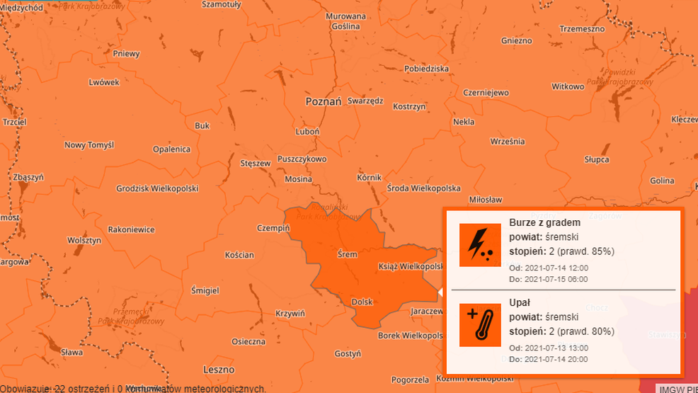 Synoptycy przewidują, że pierwsze grzmoty mogą pojawić się już około godziny dwunastej. To właśnie od tego momentu zacznie także obowiązywać ostrzeżenie Instytutu Meteorologii i Gospodarki Wodnej. Według IMiGW szanse na burze wynoszą około 85%. Wyładowania są przewidywane w całym województwie. Oprócz tego przewidywany jest grad. Komunikat ma przestać obowiązywać w czwartek 15 lipca o godzinie 6:00.