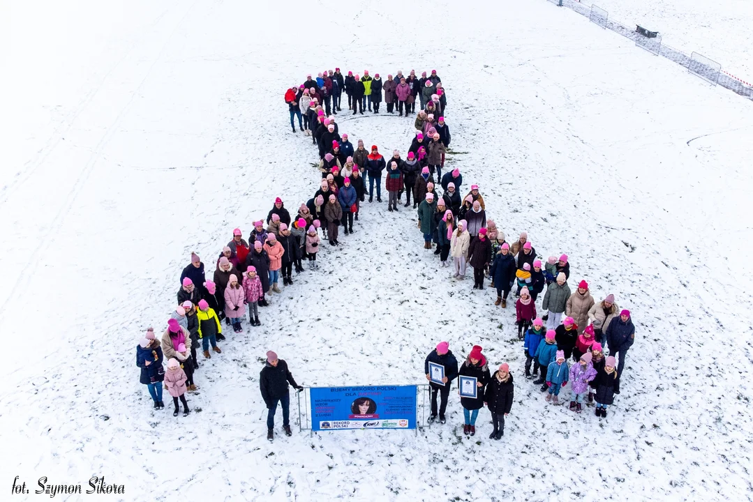Jednak najbliżsi Justyny na tym nie poprzestali. Zorganizowali akcję bicia rekordu Polski na największy wzór różowej wstążki utworzony z ludzi.