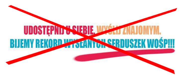 „Uwaga! Ktoś podszywa się pod WOŚP i rozsyła łańcuszki szczęścia z serduszkiem Orkiestry. WOŚP nie wysyła łańcuszków. To robią spamerzy. „Łańcuszek internetowy” to SPAM zawierający w treści polecenie lub prośbę o rozesłanie danej wiadomości do jak największej liczby odbiorców. Motywem działania łańcuszków jest przechwytywanie adresów mailowych rzeczywistych i aktywnych użytkowników przez firmy zajmujące się masowym rozsyłaniem nie zamawianych informacji reklamowych. Powszechnie zalecanym działaniem w przypadku otrzymania listu-łańcuszka jest jego usunięcie i nieprzesyłanie go dalej. Jeżeli nie chcecie, aby ktoś przechwycił Wasze konta… nie wysyłajcie łańcuszków. Zamiast udawać przed samym sobą, że coś zrobiliście, zaangażujcie się w realne działania” - taka wiadomość krąży po mediach społecznościowych w celu ostrzeżenia użytkowników.