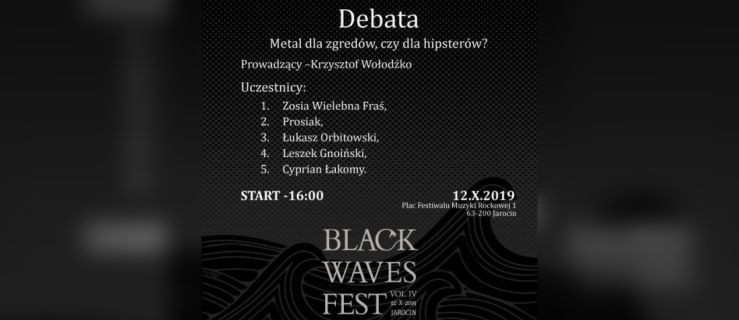 Niewątpliwie ciekawą imprezą organizowana w ramach czwartej już edycji Black Waves Fest będzie debata na dość zaskakujący temat – „Metal dla zgredów czy dla hipsterów”. Wśród uczestników dyskusji znalazł się Łukasz Orbitowski - pisarz, eseista, promotor metalu w mainsteamie popkultury. Jego ostatnia książka „Kult” spotkała się z dużym zainteresowaniem czytelników.