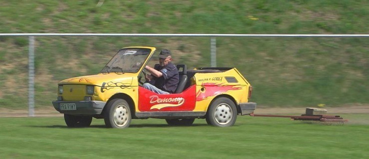 Pomalowany w barwy Demonów, żółty fiat 126p wykonuje na boisku ciężką pracę, której niejeden ciągnik by się nie powstydził.
