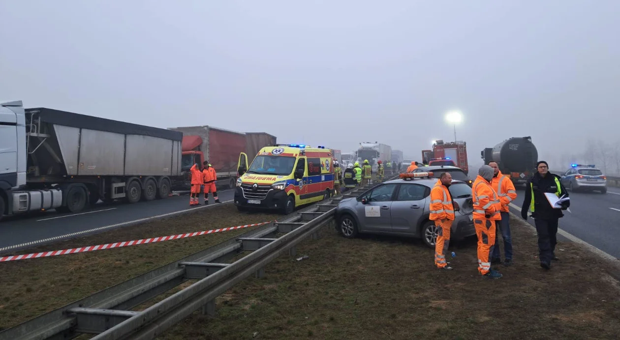 Możemy podzielić te zdarzenia na 3 strefy. Pierwszy wypadek busa z koparką, potem zderzenie dwóch ciężarówek i busa. W dalszej kolejności karambol z udziałem bodajże 9 pojazdów - informuje kpt. Szymon Kurpisz, oficer prasowy Komendy Miejskiej Państwowej Straży Pożarnej w Lesznie.