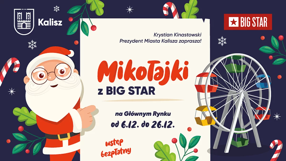 Kalisz szykuje się na wyjątkowe Mikołajki, które odbędą się na Głównym Rynku 6 grudnia o godz. 17. Dzięki wsparciu sponsora, firmy BIG STAR, na mieszkańców czeka wiele bezpłatnych atrakcji. Od spotkania ze św. Mikołajem po koncerty i świąteczne warsztaty – każdy znajdzie coś dla siebie. Wszystkie atrakcje są bezpłatne!