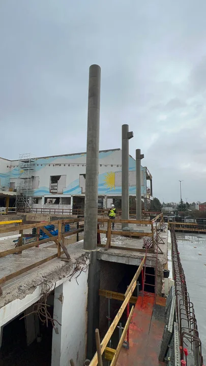 Choć z zewnątrz tempo przemian nie wydaje się imponujące, wewnątrz obiektu prace idą pełną parą. W najbliższych dniach rozpocznie się montaż konstrukcji zadaszenia nad przyszłymi nieckami basenowymi. Wszystkie elementy z drewna klejonego są już przygotowane, a 15 grudnia planowane jest ich osadzenie na odlewanych właśnie słupach żelbetowych. Jeszcze w tym roku obiekt ma zostać przykryty dachem z blachy trapezowej, co zabezpieczy go przed zimą i umożliwi dalsze prace w szybkim tempie.