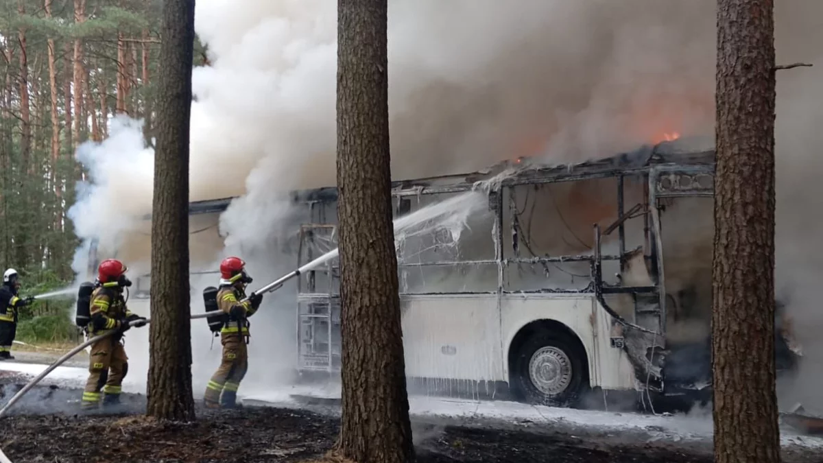 Autokar marki MAN, którym dzieci wraz z opiekunami jechały na wycieczkę do "Zagrody Rodzinnej - Siedlisko Józefówka'', spłonął niemal doszczętnie.