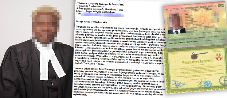 Wielkopolska. - Skontaktowałem się z tobą z powodu twojego nazwiska w związku z nazwiskiem mojego zmarłego klienta. Jako osobisty adwokat zmarłego pana Jovan Twardowski [nazwisko autorki artykułu – przyp. red.], moim obowiązkiem jest odzyskać jego majątek i oczyścić jego nazwisko, ponieważ jego żona i jedyne dziecko zmarły wraz z nim w strasznym wypadku samochodowym – wiadomość o takiej treści trafiła niedawno na skrzynkę e-mail naszej dziennikarki. Zaintrygowani, postanowiliśmy sprawdzić, kto kryje się za tą informacją i rozpoczęliśmy korespondencję. „Adwokat” o imieniu Fred zapewnił w odpowiedzi o swoich czystych intencjach.