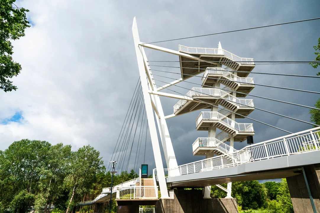 Jedną z głównych atrakcji kładki jest wieża z dwoma platformami widokowymi na wysokościach 12 i ponad 20 metrów. Zapewniają one możliwość podziwiania piękna rzeki Warty i okolicznej przyrody z poziomu koron drzew. Część mostowa kładki składa się z trzech przęseł o konstrukcji podwieszonej z betonowym mostem o długości 133,7 metra. Całkowita długość kładki wraz z wjazdami po obu brzegach wynosi około 200 metrów, co pozwala jednocześnie korzystać z niej pieszym i rowerzystom.