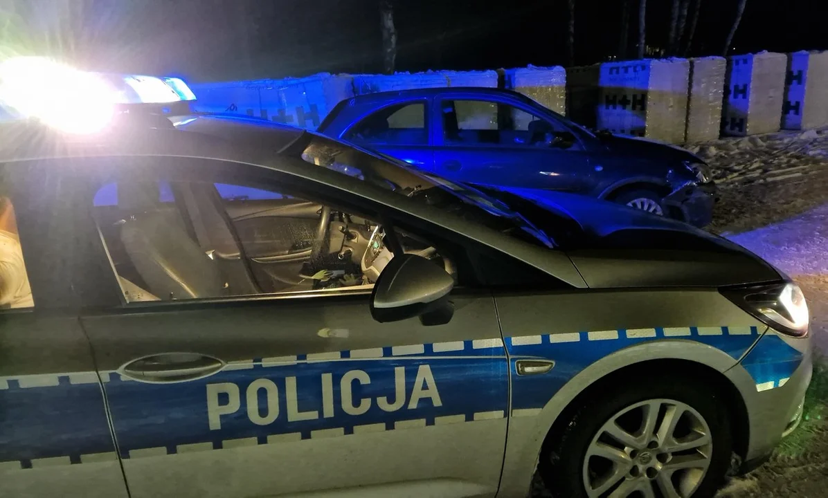 Pościg zakończył się na ul. Pułkownika Jana Malińskiego w Ostrzeszowie, gdy kierowca stracił kontrolę na autem i uderzył w stojącą na poboczu w paletę z pustakami.