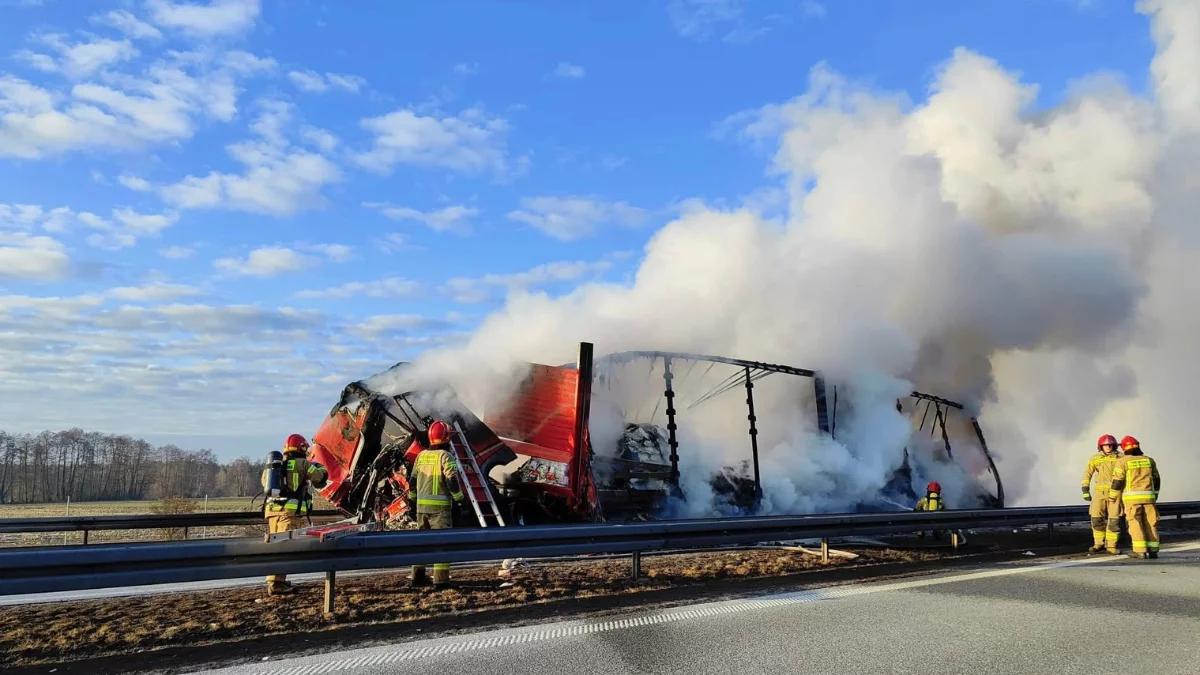 W wyniku zderzenia doszło do zapalenia się jednego z pojazdów ciężarowych. Na miejscu trwa akcja gaśnicza.