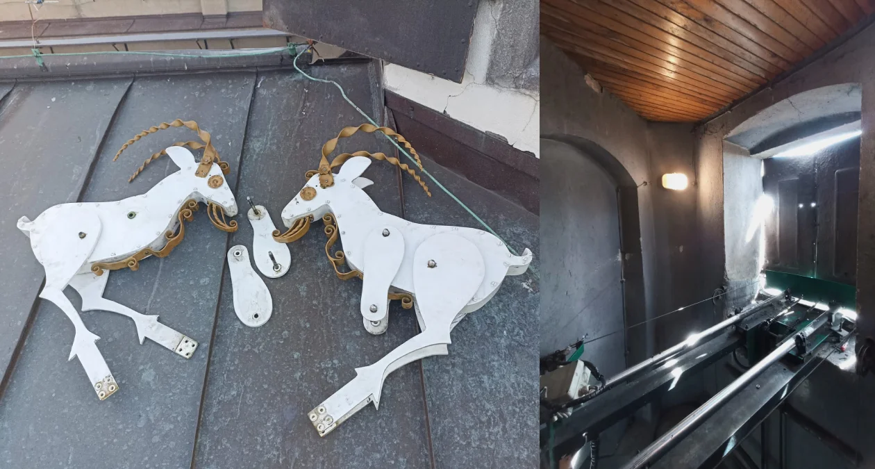 Obecnie trwa naprawa mechanizmu koziołków. Zostały już zdemontowane reduktory, silniki i śruba napędowa. Kilka dni temu figury koziołków wraz z prowadnicami zostały przewiezione do warsztatu w Puszczykowie. Tam specjaliści likwidują luzy na osiach i wymieniają wysłużone łożyska. Prace te są konieczne, aby koziołki mogły wrócić do pełnej sprawności i cieszyć mieszkańców Poznania.