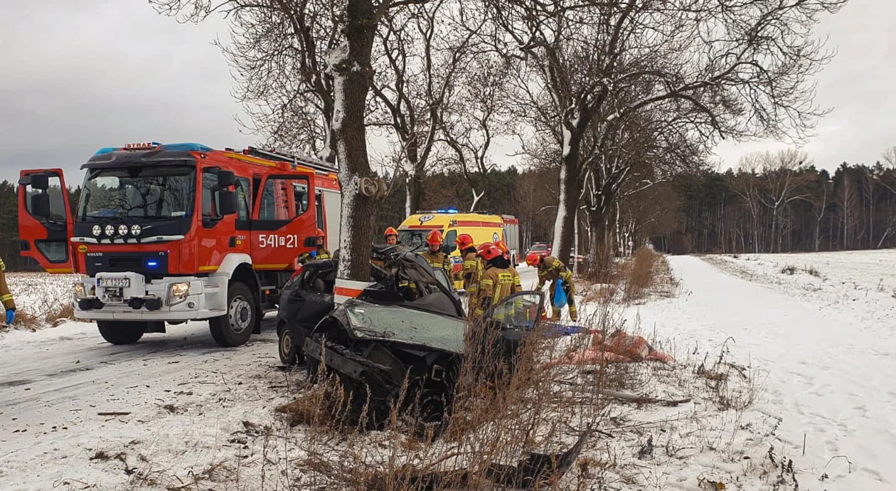 Na lokalnej drodze w Olszynie pod Ostrzeszowem 19-letni mieszkaniec gminy Kobyla Góra prawdopodobnie stracił panowanie nad samochodem, wpadł w poślizg i uderzył w drzewo. Siła była tak duża, że auto dosłownie owinęło się wokół pnia.