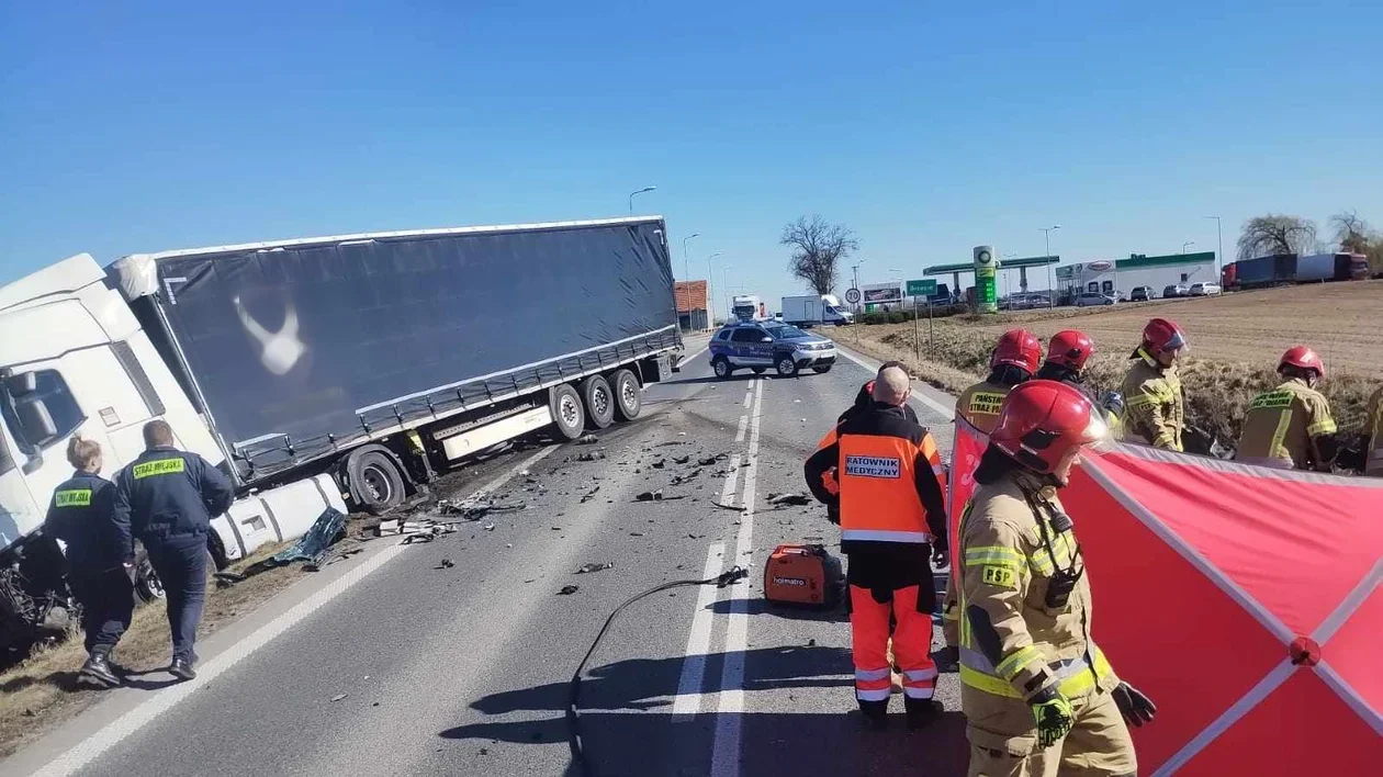 Dziś przed godz. 13.00 na ul. Pleszewskiej w Brzeziu, na DK nr 12, doszło do czołowego zderzenia samochodu osobowego z ciężarówką.