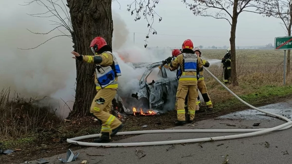 - Samochód osobowy uderzył w drzewo i stanął w płomieniach - mówi dyżurny Komendy Powiatowej Państwowej Straży Pożarnej w Pleszewie.