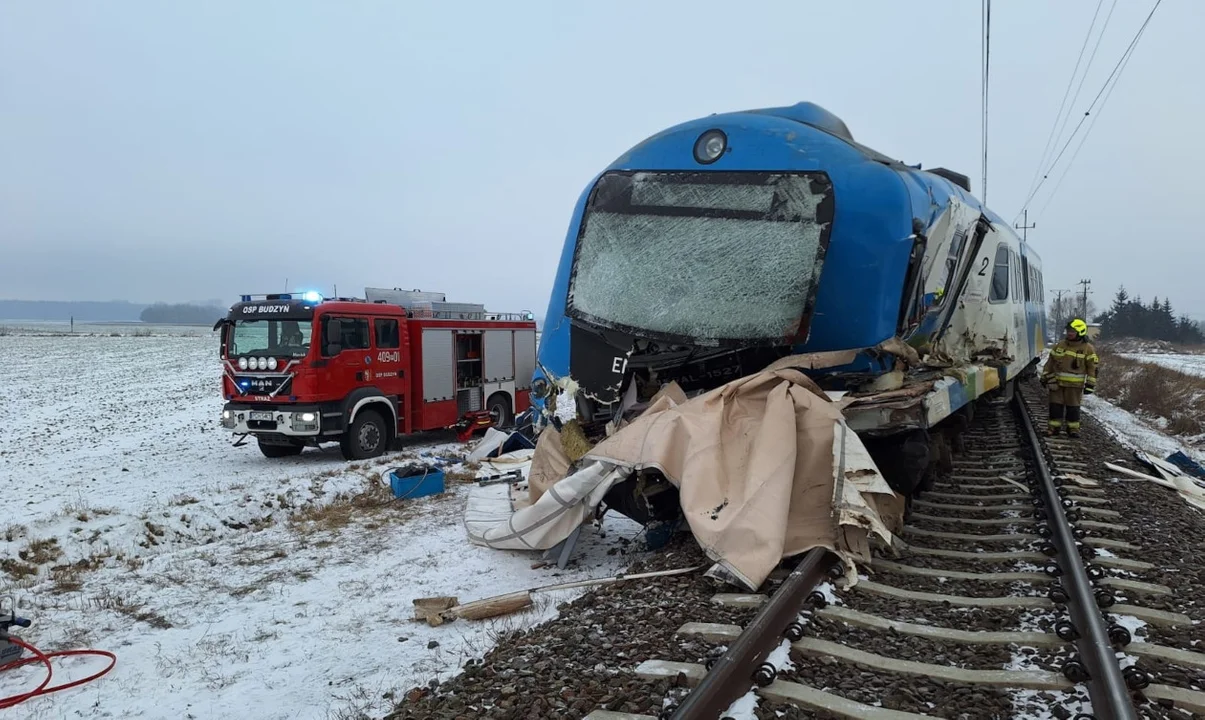 Do wypadku doszło dzisiejszego poranka (10 stycznia). Kilka minut po godz 8.00 służby zaalarmowano, że na niestrzeżonym przejeździe kolejowym w Budzyniu samochód ciężarowy zderzył się z pociągiem osobowym.