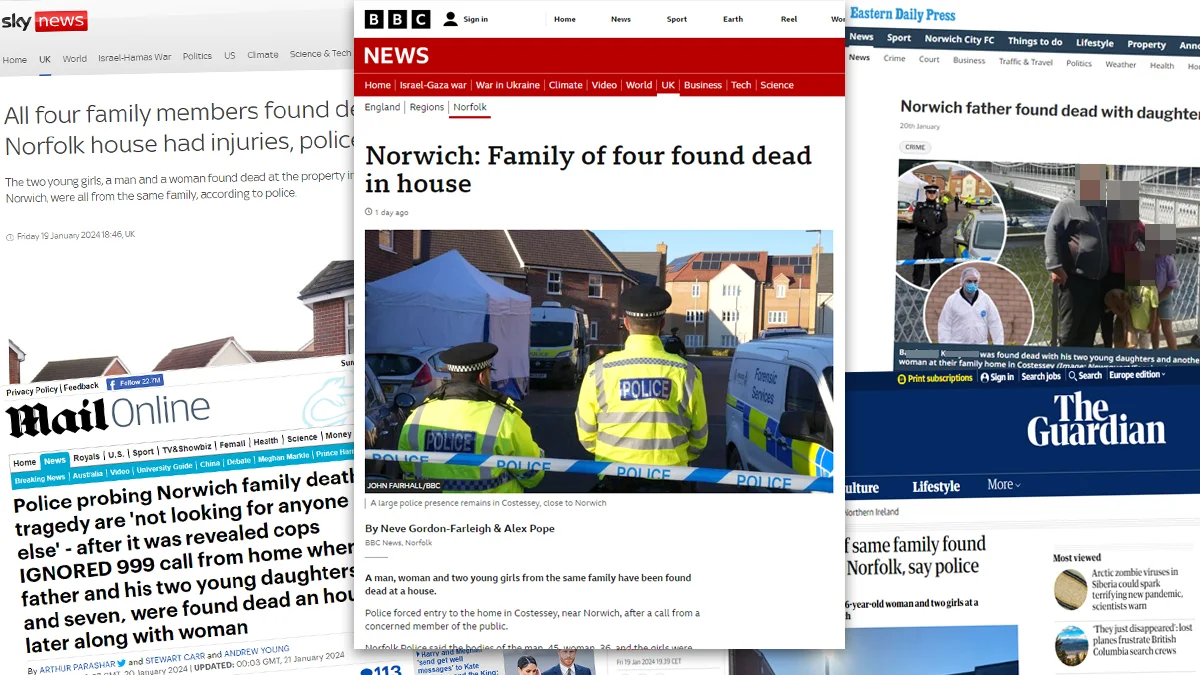 Czołowe brytyjskie media, a za nimi główne polskie portale internetowe od dwóch dni opisują to wstrząsające wydarzenie. Według ich relacji, w piątek wczesnym rankiem policja została wezwana przez zaniepokojoną osobę do domu położonego na obrzeżach Costessey. Wdarła się do środka po sforsowaniu drzwi. Tam funkcjonariusze odkryli ciała czterech osób: 45-letniego mężczyzny, 36-letniej kobiety oraz dwóch młodych dziewcząt. Wszystkie ofiary miały obrażenia.