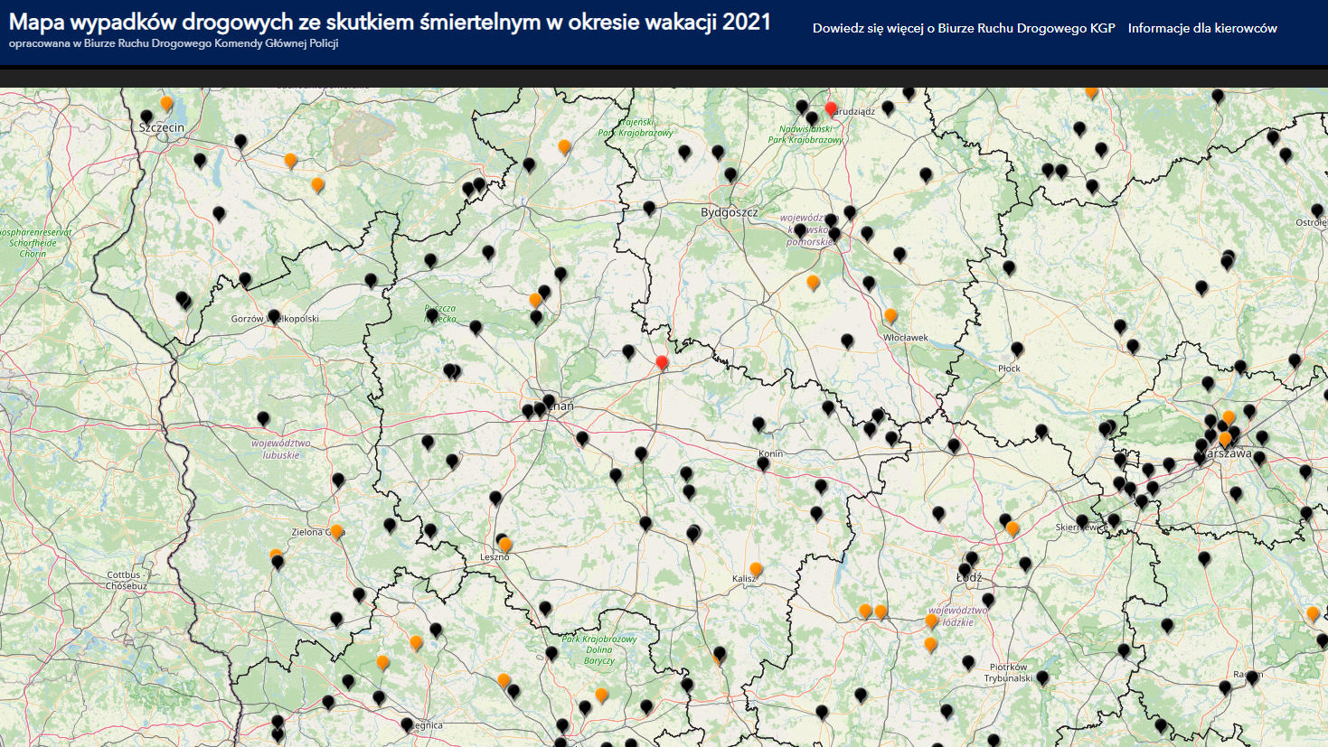 Policja przedstawia aktualizowana na bieżąco mapę wypadków drogowych ze skutkiem śmiertelnym. Ten tragiczny obraz oprócz lokalizacji zdarzenia zawiera także informacje dotyczące liczby ofiar, rodzaju uczestnika ruchu drogowego oraz rodzaju zdarzenia. Podawane są na bieżąco dane z ostatniej doby oraz od początku wakacji.